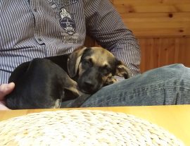 Wer jetzt denkt, meine Darstellung sei hemmungslos übertrieben und in weiten Teilen sogar völlig frei erfunden… Nein. Zu unserem großen Bedauern leider: Nein. Aber ab diesem Tag wurde es mit jedem Tag ein bisschen besser. Der zweite Tag verlief schon ein kleines bisschen ruhiger (was wahrscheinlich in großen Teilen der Tatsache geschuldet war, dass eine liebe Freundin mich auf die grandiose Idee brachte, Murphys alte XXL-Reisebox einfach als Welpenlaufstall zu benutzen. Und schon am vierten Tag brauchten wir die Box nur noch für besondere Anlässe. Da konnte Penny schon bis zu 30 Minuten auf dem Sofa liegen und fernsehen, wenn ich mal schnell duschen oder zum Briefkasten gehen wollte. Diese immense Reizüberflutung der ersten Tage schwächte ab, und mittlerweile ist Penny ein ganz normaler Junghund. Wir sind froh, dass wir sie haben.