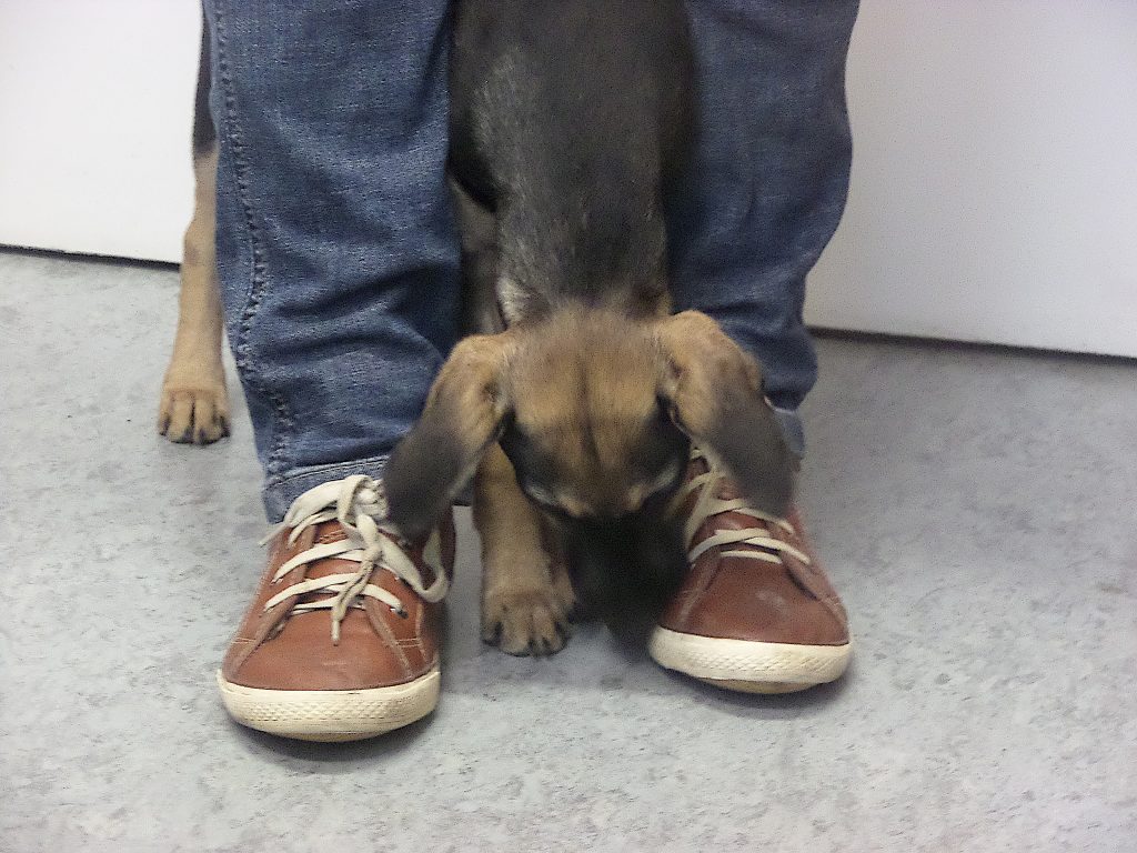Nach einigem Hin und Her kamen meine Menschen dann überein, dass es vielleicht gar nicht so gut sei, wenn ich den ganzen Tag vom Rudel getrennt sei. Das könnte sich negativ auf unsere Bindung auswirken. Sachte Frauchen. Also haben wir überlegt, ob ich einfach einen der Menschen bei seinem Job unterstütze. Den Großen zum Beispiel… Den ganzen Tag unterm OP-Tisch liegen und darauf warten, dass was runterfällt, hätte mir gefallen. Aber das geht angeblich nicht. Hygiene und so. Das mit der Hygiene hatte er doch schon mal angebracht und innerhalb von Nanosekunden wieder verworfen, als ich meine heutige Familie das erste Mal besucht hatte, erinnert ihr euch? (Da ist sie, unsere Penny!)